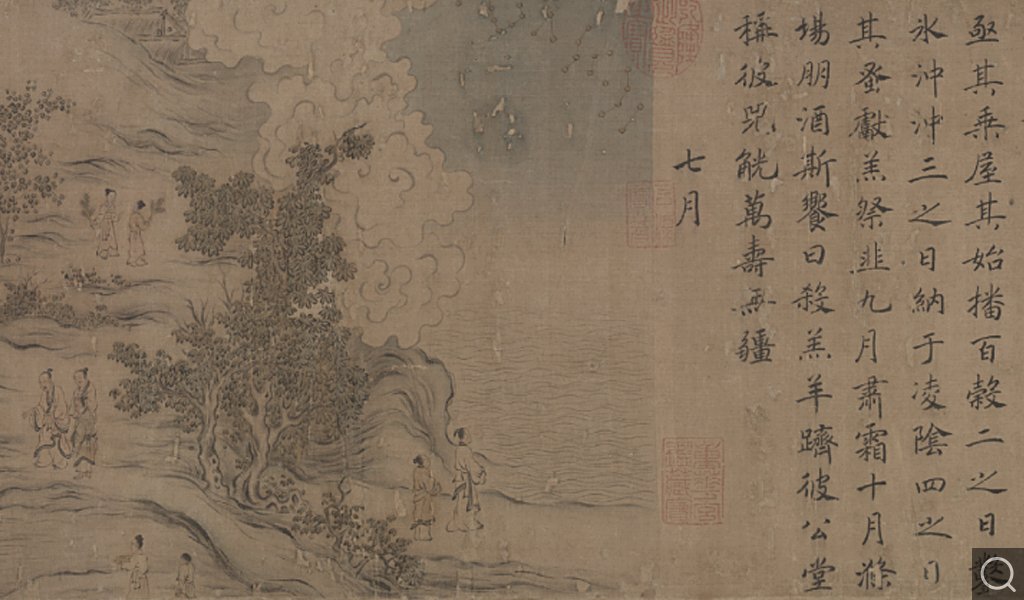 本幅宋高宗趙構楷書,馬和之設色畫《豳風》 之《七月》、《鴟鸮》、《東山》、《破斧》、《伐柯》、《九罭》、《狼跋》 七篇全,右書左畫,每篇相間。后幅乾隆帝御識行書:“《石渠寶笈》舊藏《豳風圖》卷,止有六篇,而《破斧》篇別為一卷,亦續入內府?!痹斒銎湓?。
